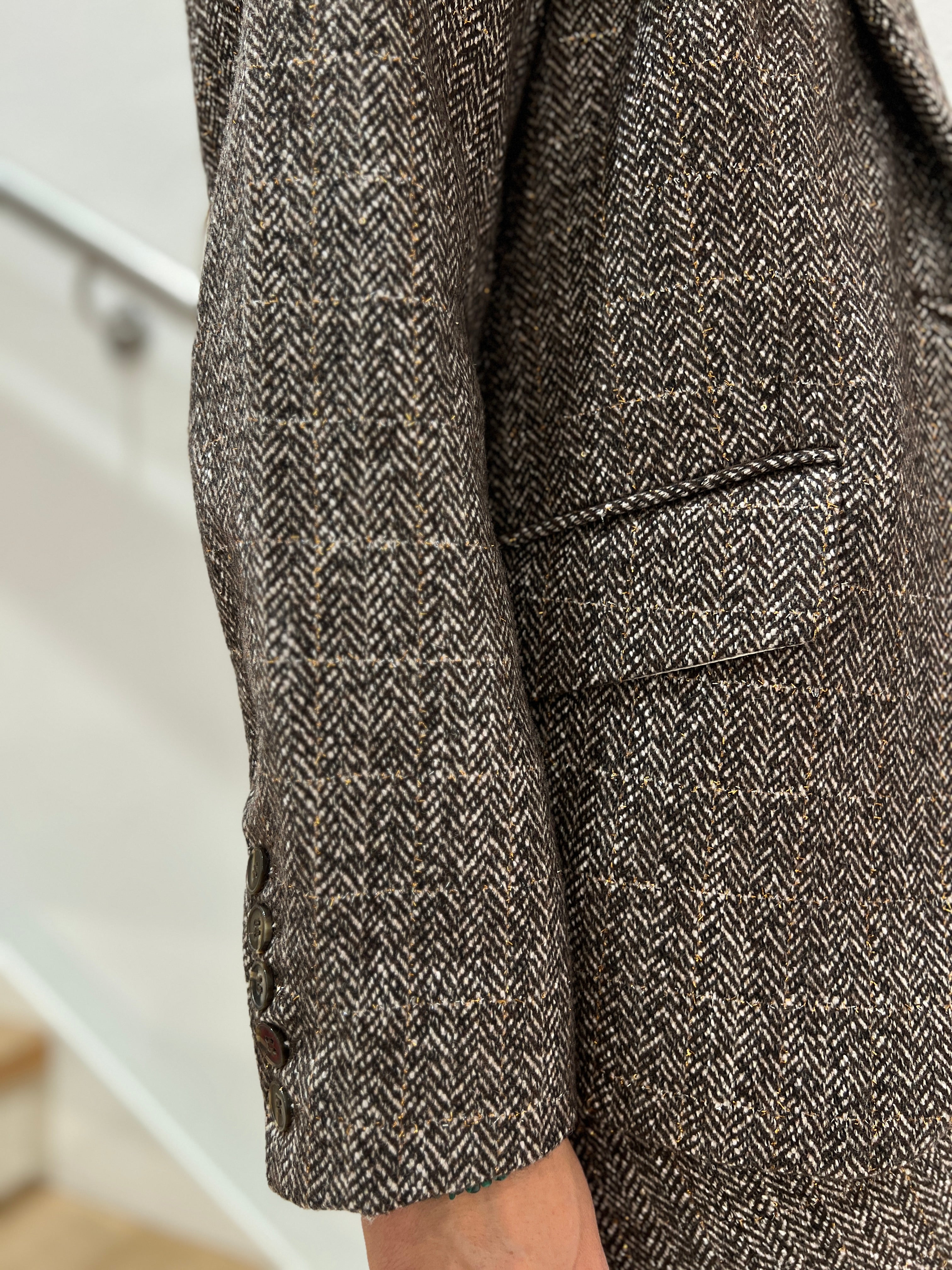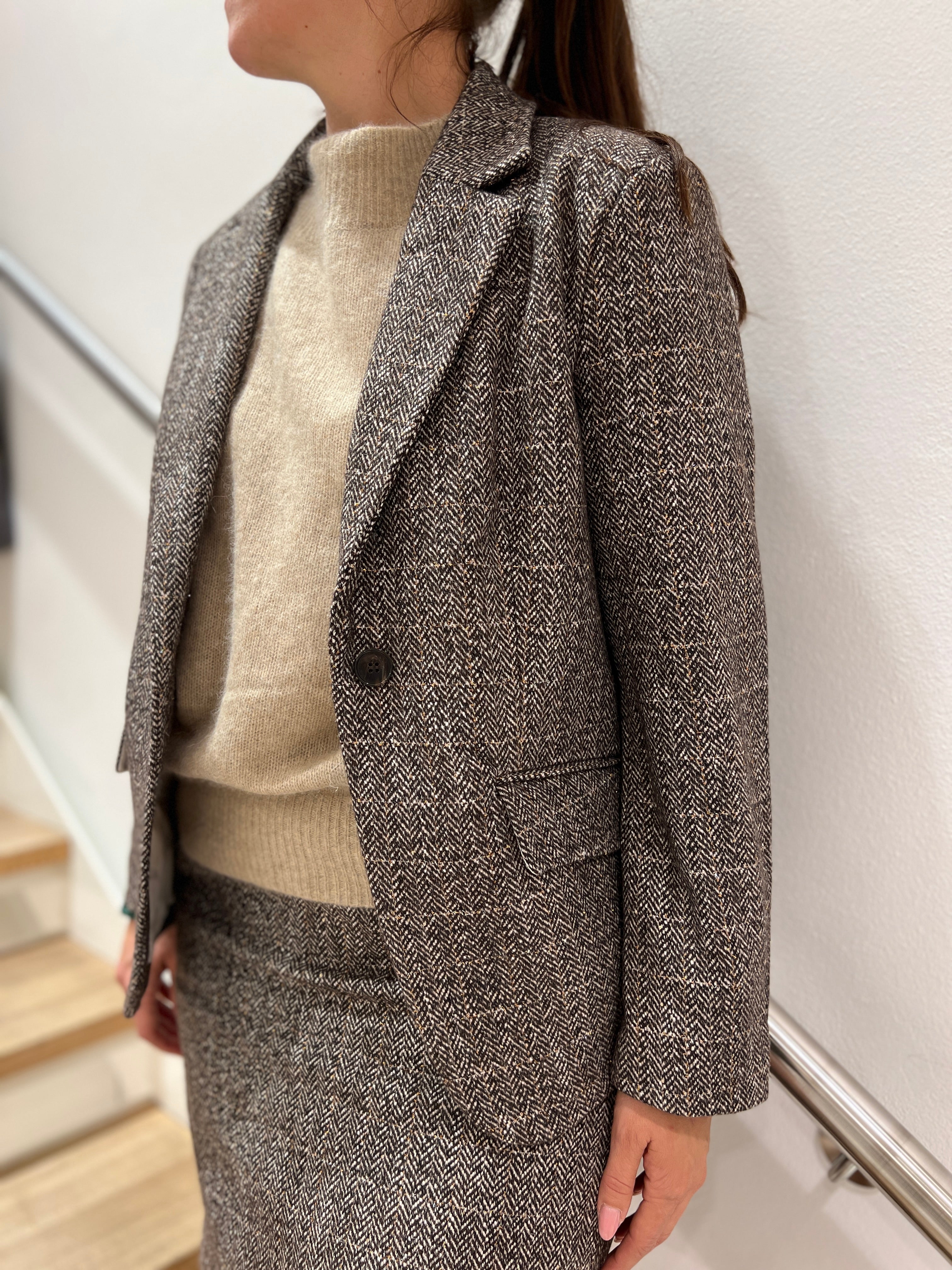 Materiale: 60% Uld, 22% Polyester, 15% Viskose, 3% Lurex, Foer: 55% Polyester, 45% Viskose