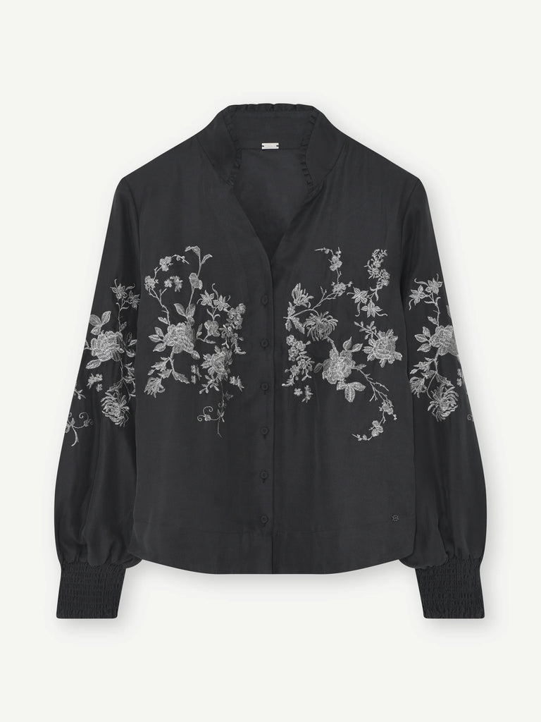 En elegant bluse med åben stolpelukning og afrundet kant, der skaber et klassisk og sofistikeret udtryk. Den skjulte søm ved halsudskæringen og fine afslutninger understreger blusens eksklusive kvalitet.