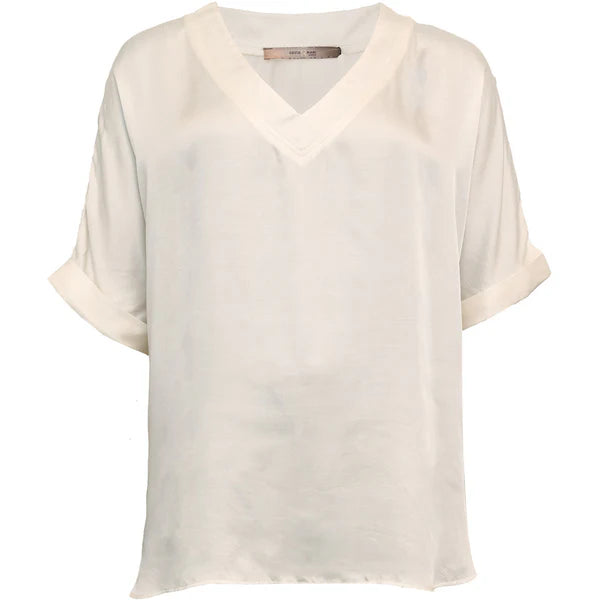 Enkelt og behagelig bluse med kort ærmer. Blusen er løstsiddende, har en god længde ned til hoften samt en v-hals. Blusen fås i farverne white, navy, army & black.