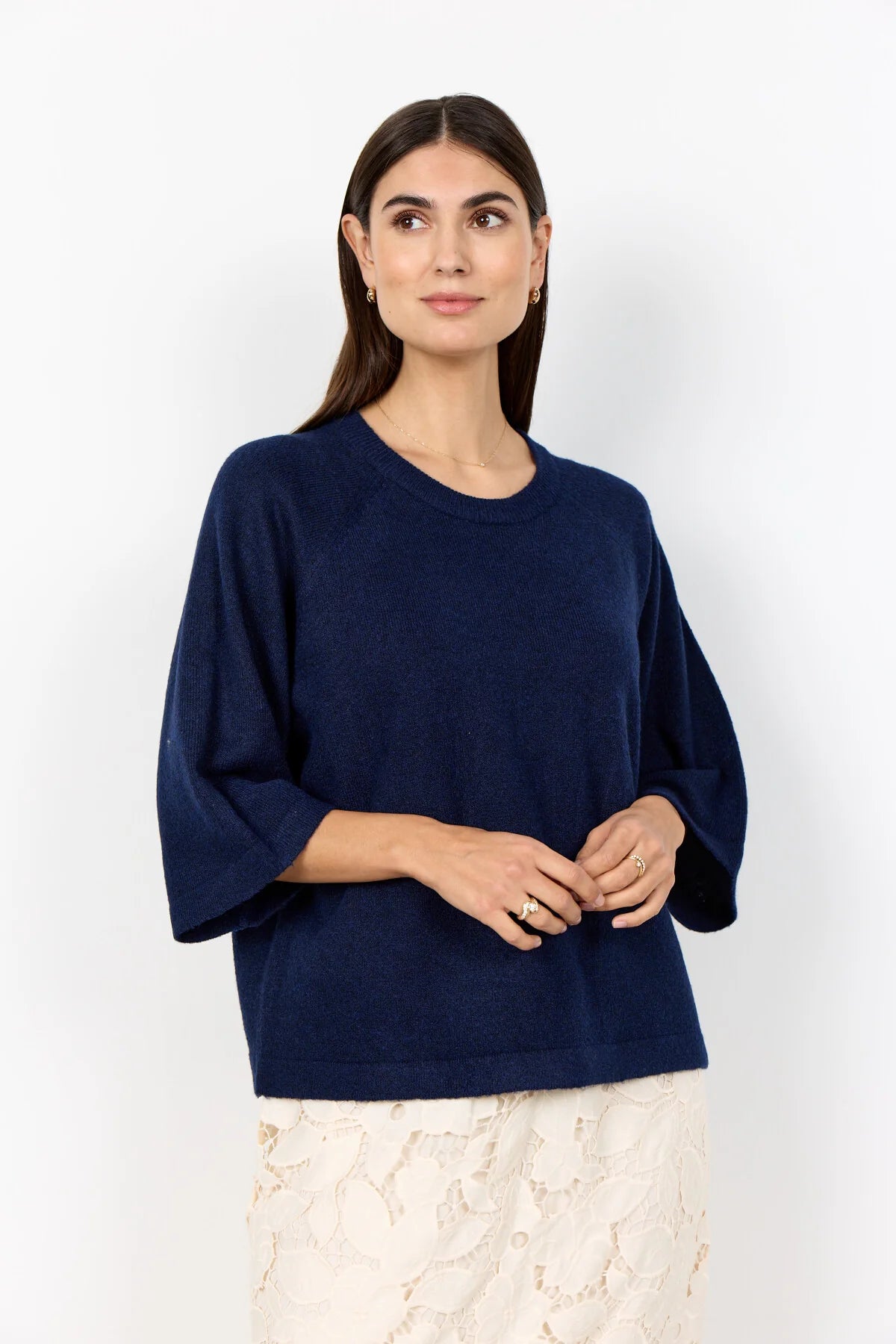 Sød lille strik med rund hals og 3/4-ærmer med vidde.
