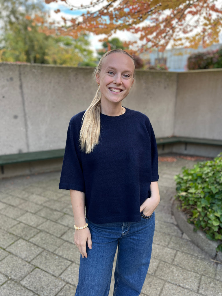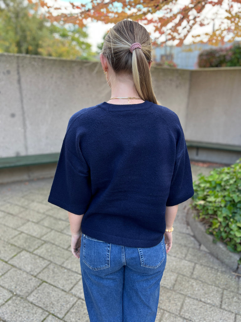 Sød lille strik med rund hals og 3/4-ærmer med vidde.