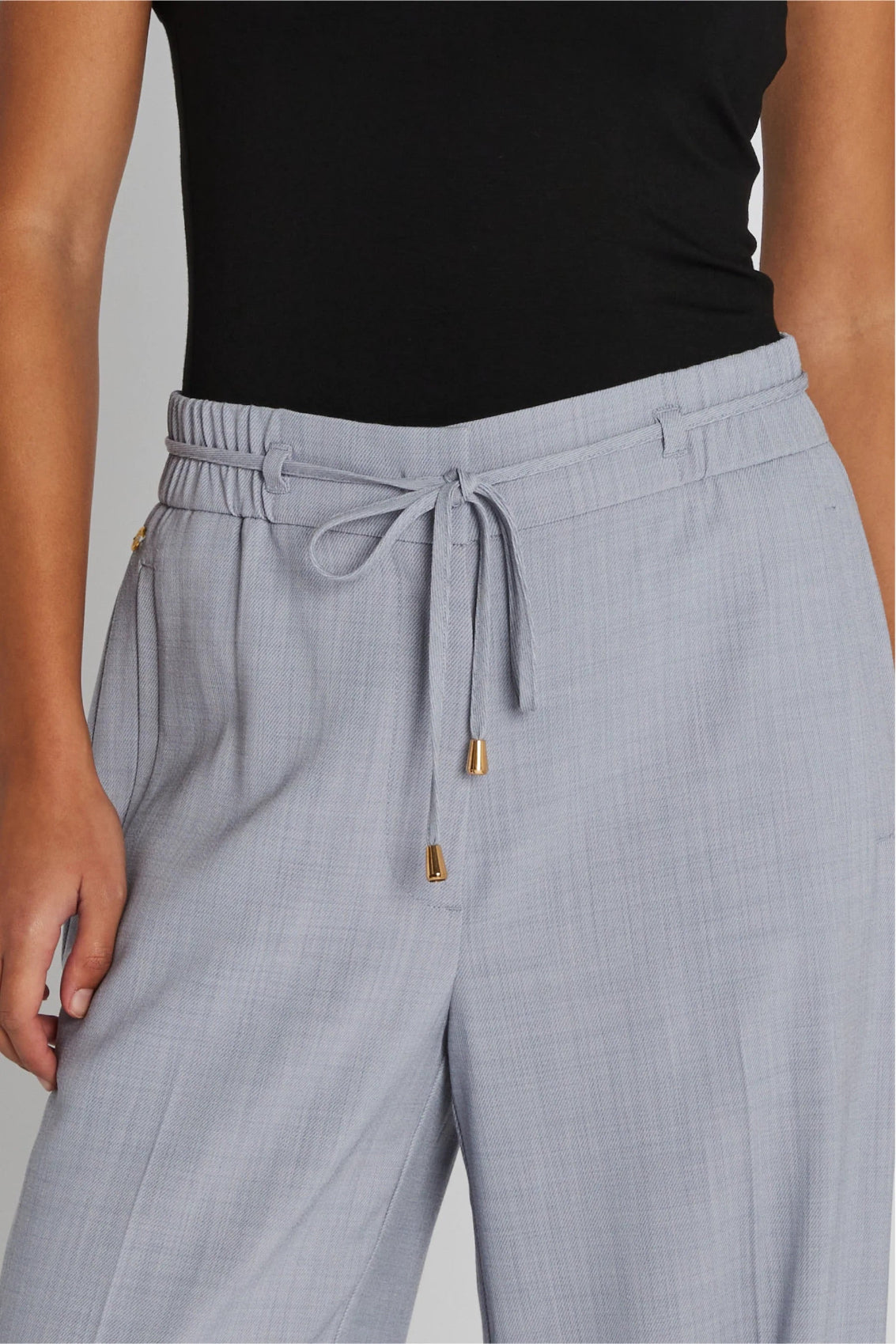 Noa pants feature a long, straight silhouette with an elasticated waist and tie belt, creating a relaxed yet polished look in the lightly textured fabric.
