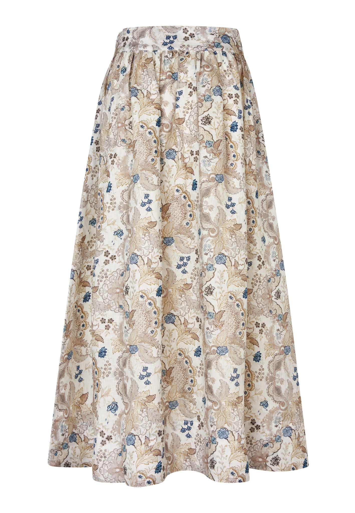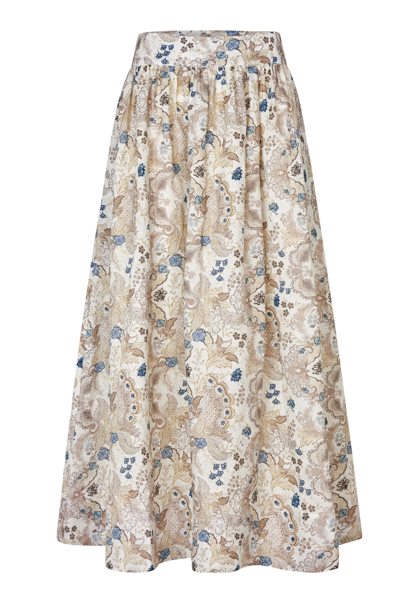 FEMININE AND COMFORTABLE FOR A SUMMER DAY, THIS BEAUTIFUL LINEN SKIRT IN A PRETTY FLORAL PRINT OF NATURAL SHADES FALLS FROM A WIDE, HIGH WAISTBAND TO A FULL FLARED SHAPE THAT ENDS AT MID CALF. IT IS FULLY LINED AND THERE ARE SIDE POCKETS TO GIVE AN EASY ATTITUDE.