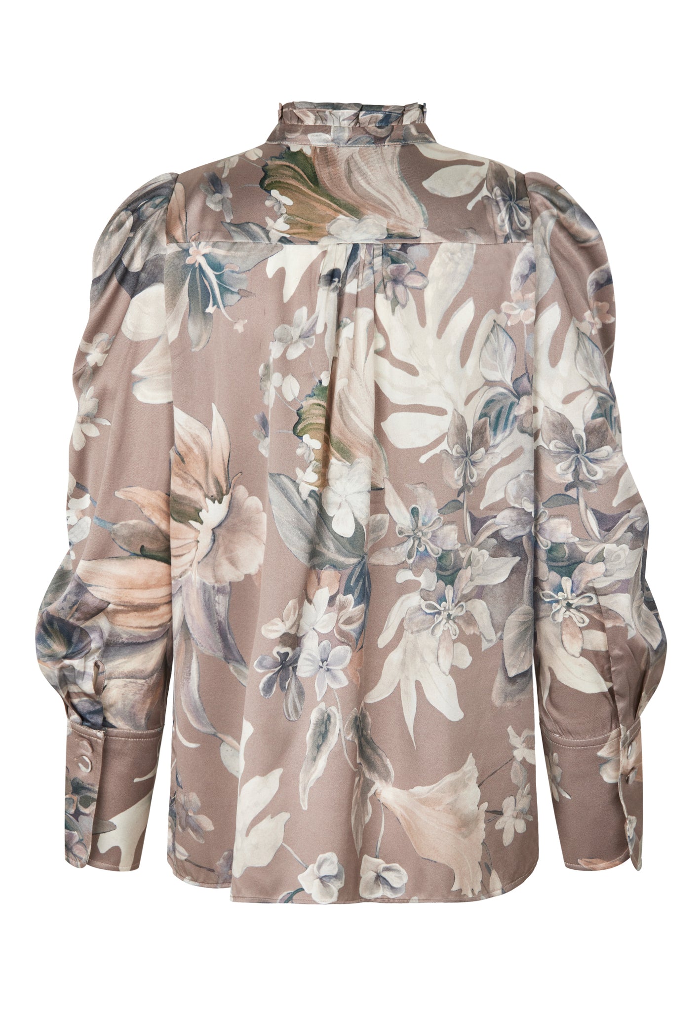 THIS SOPHISTICATED AND ELEGANT BLOUSE IN FLORAL PRINTED SILK HAS TWO FRILLS CREATING A STAND COLLAR AND COVERED BUTTONS DOWN THE FRONT. SMALL TUCKS GATHER AT THE FRONT AND BACK NECK AND THERE ARE DETACHABLE SELF FABRIC SHOULDER PADS.