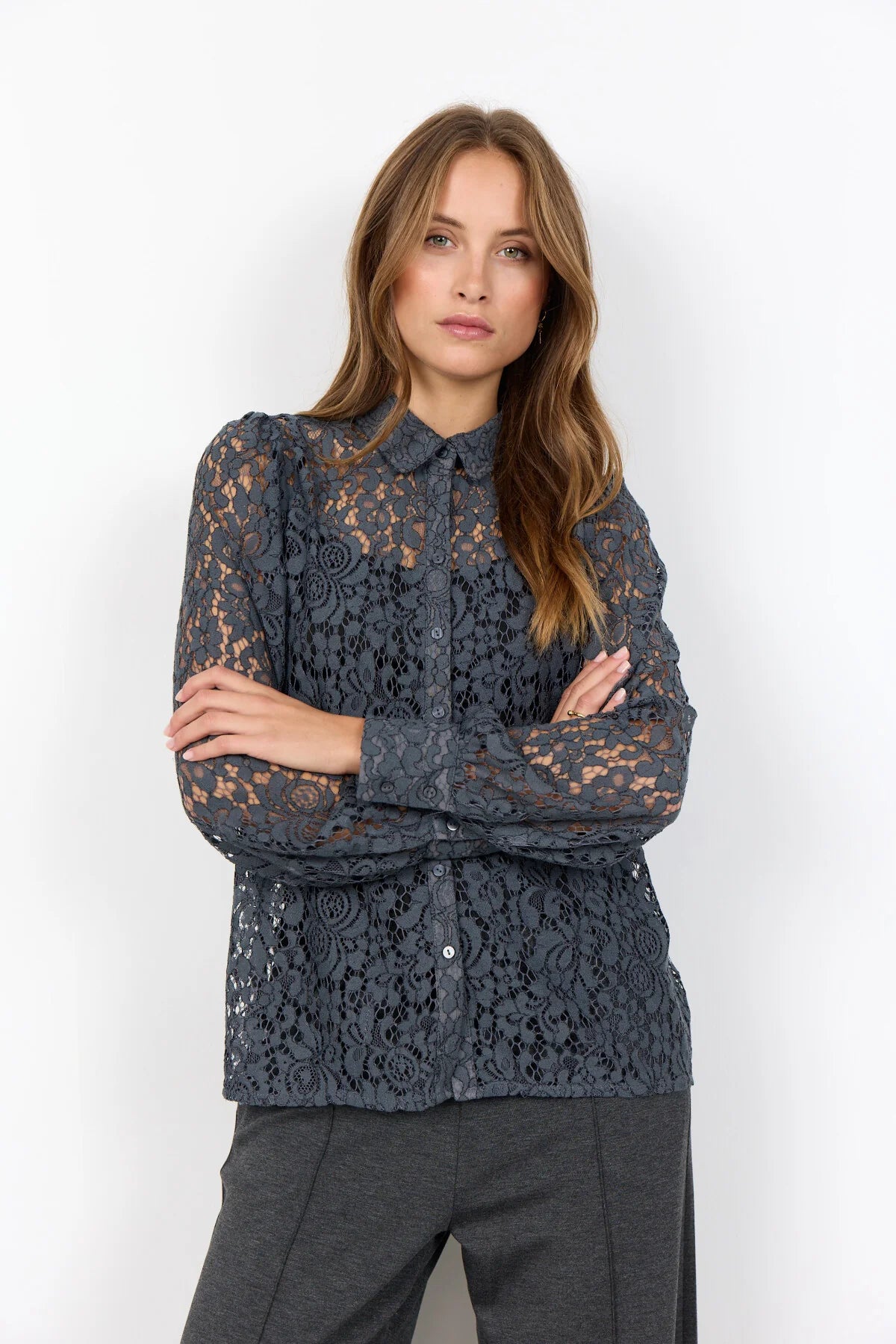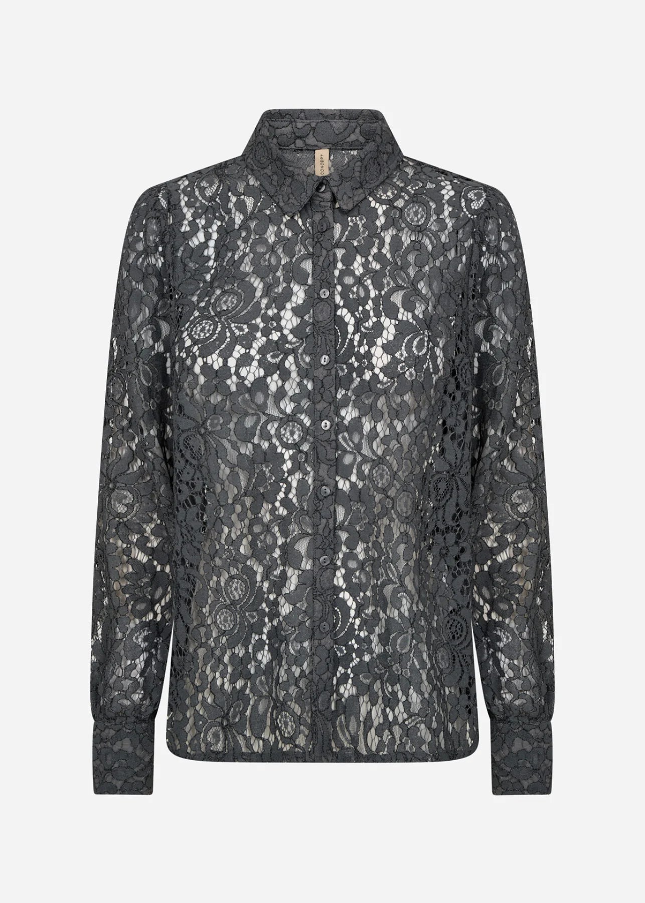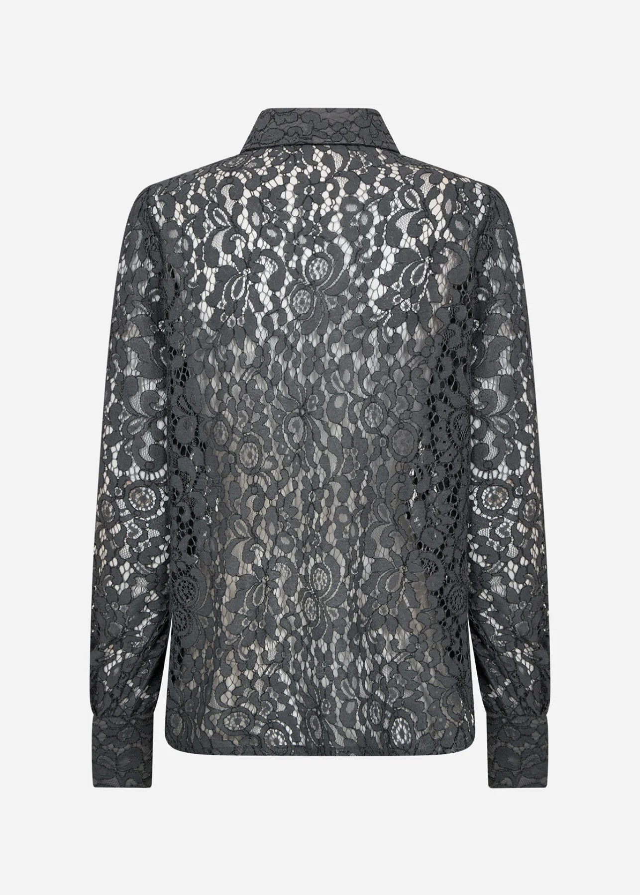 Skjorten har en klassisk krave, en knapstolpe, lange ærmer og et flot blondemateriale.