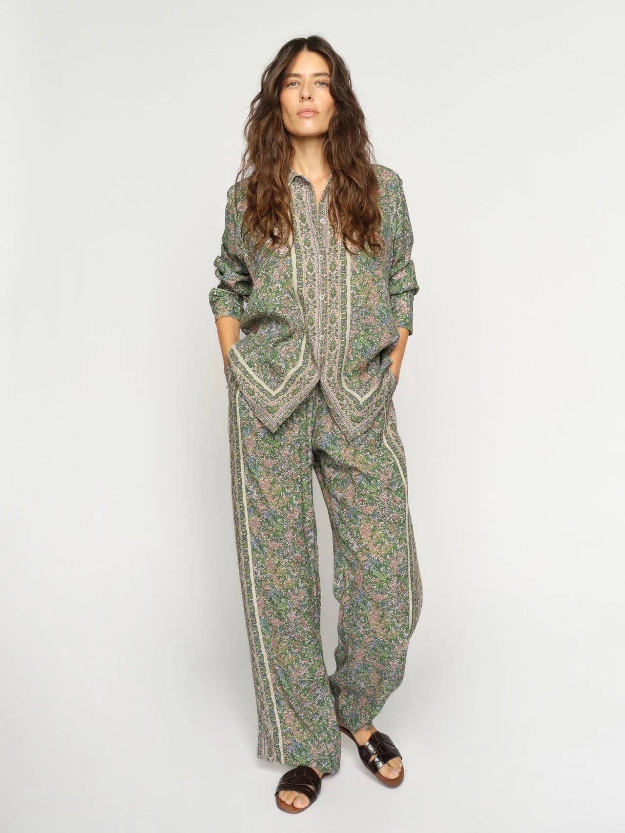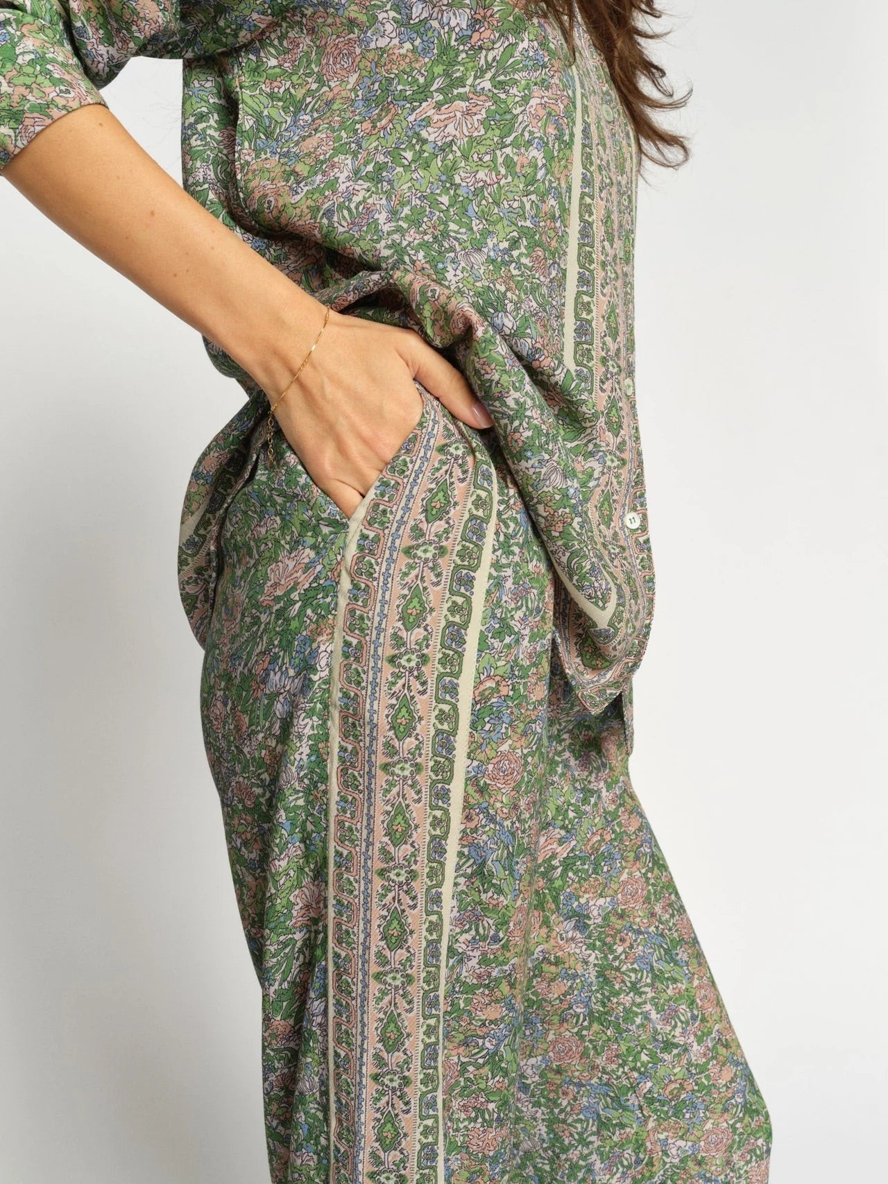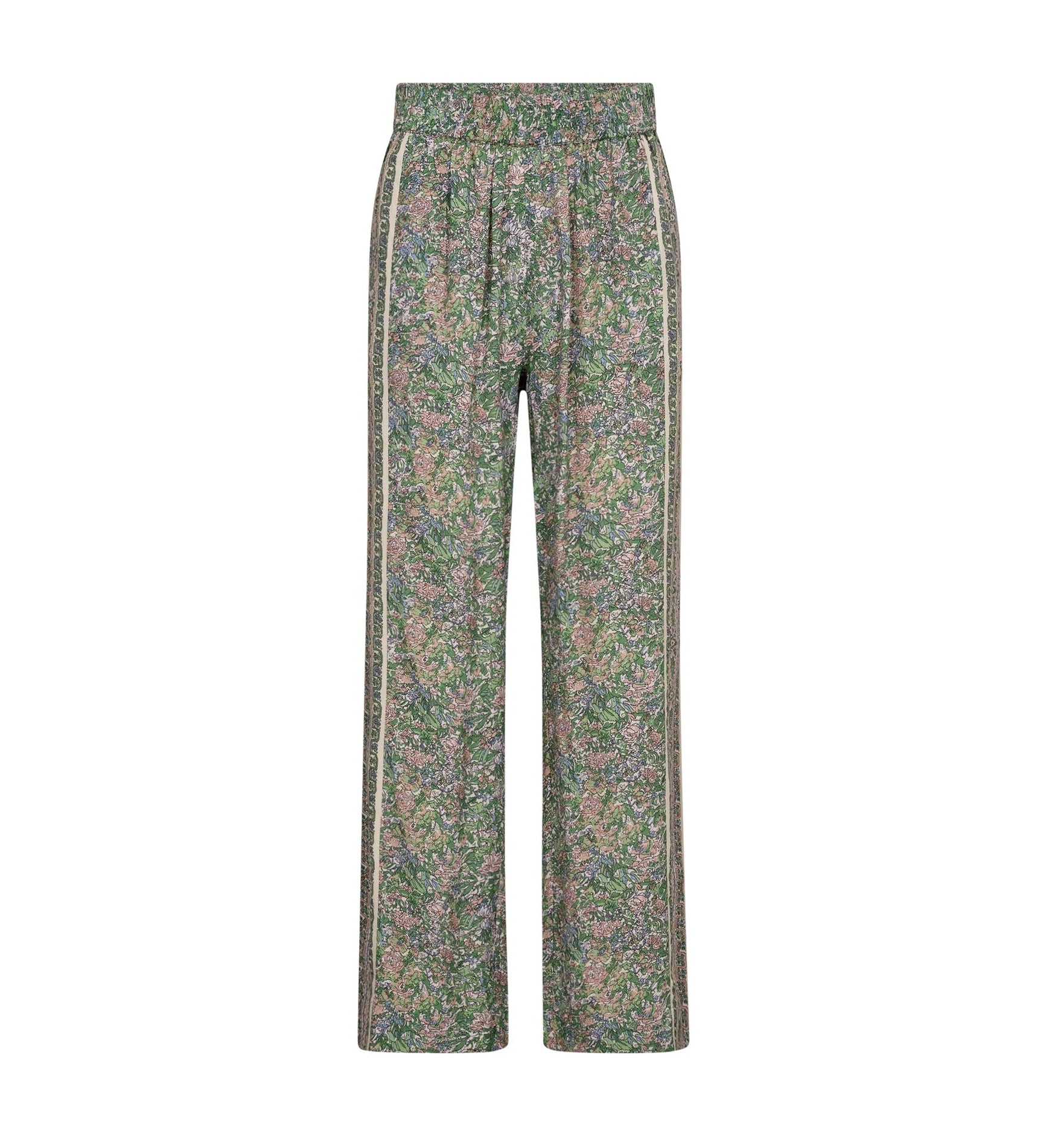Disse elegante bukser er designet i en afslappet silhuet med vide ben og en behagelig elastisk linning. De har et smukt blomstermønster, der tilfører et feminint touch til looket. Fremstillet i et blødt og let materiale, der bevæger sig ubesværet med kroppen – perfekte til både afslappede dage og mere elegante anledninger.