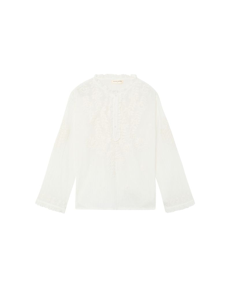 Smukkste bluse i bomulds-gaze med tone-i-tone broderier foran og ved manchetter