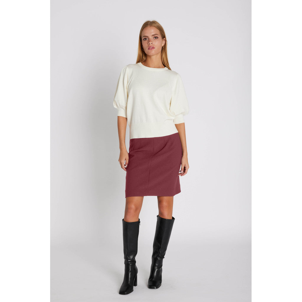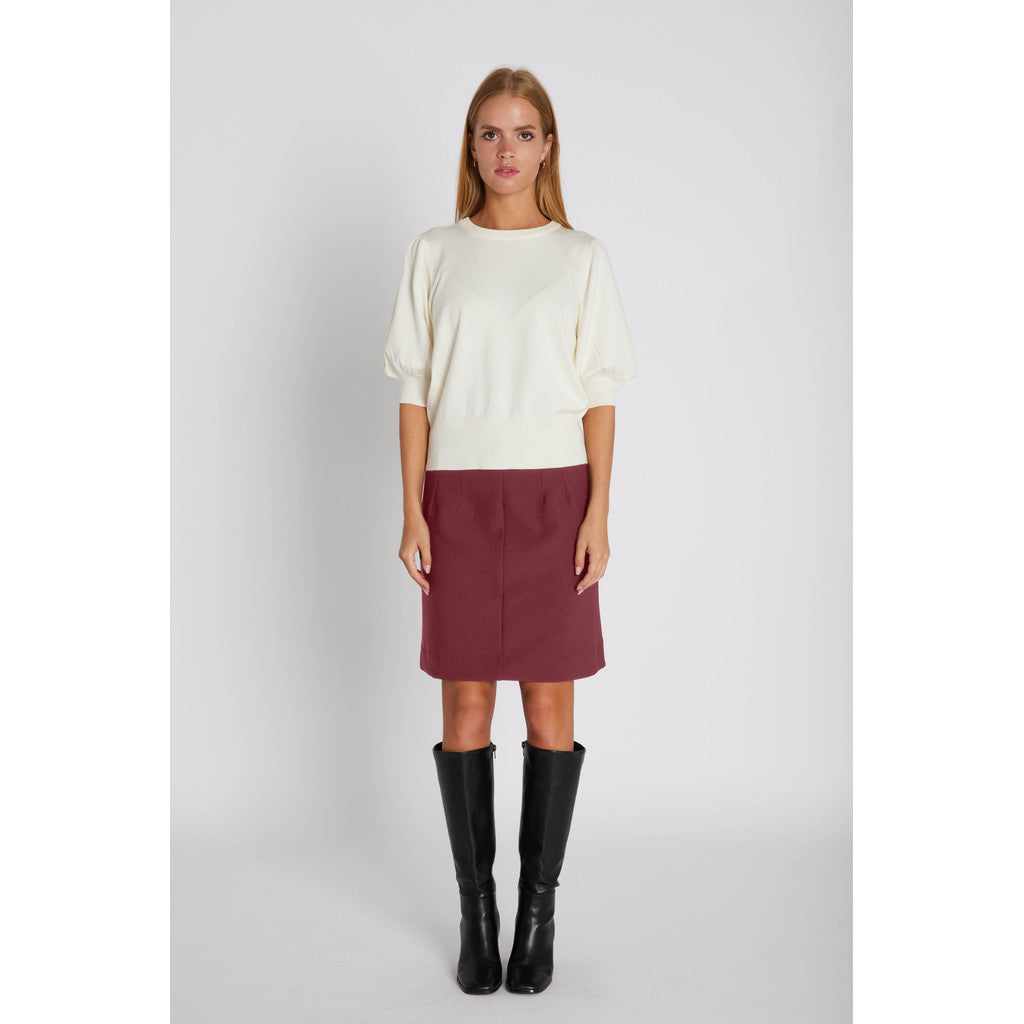 Olana er en enkelt og elegant mini skirt med lige linjer og høj talje. Den kan styles casual med en stor strik, eller feminint og elegant med en flot skjorte.