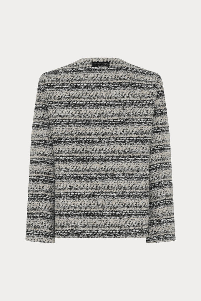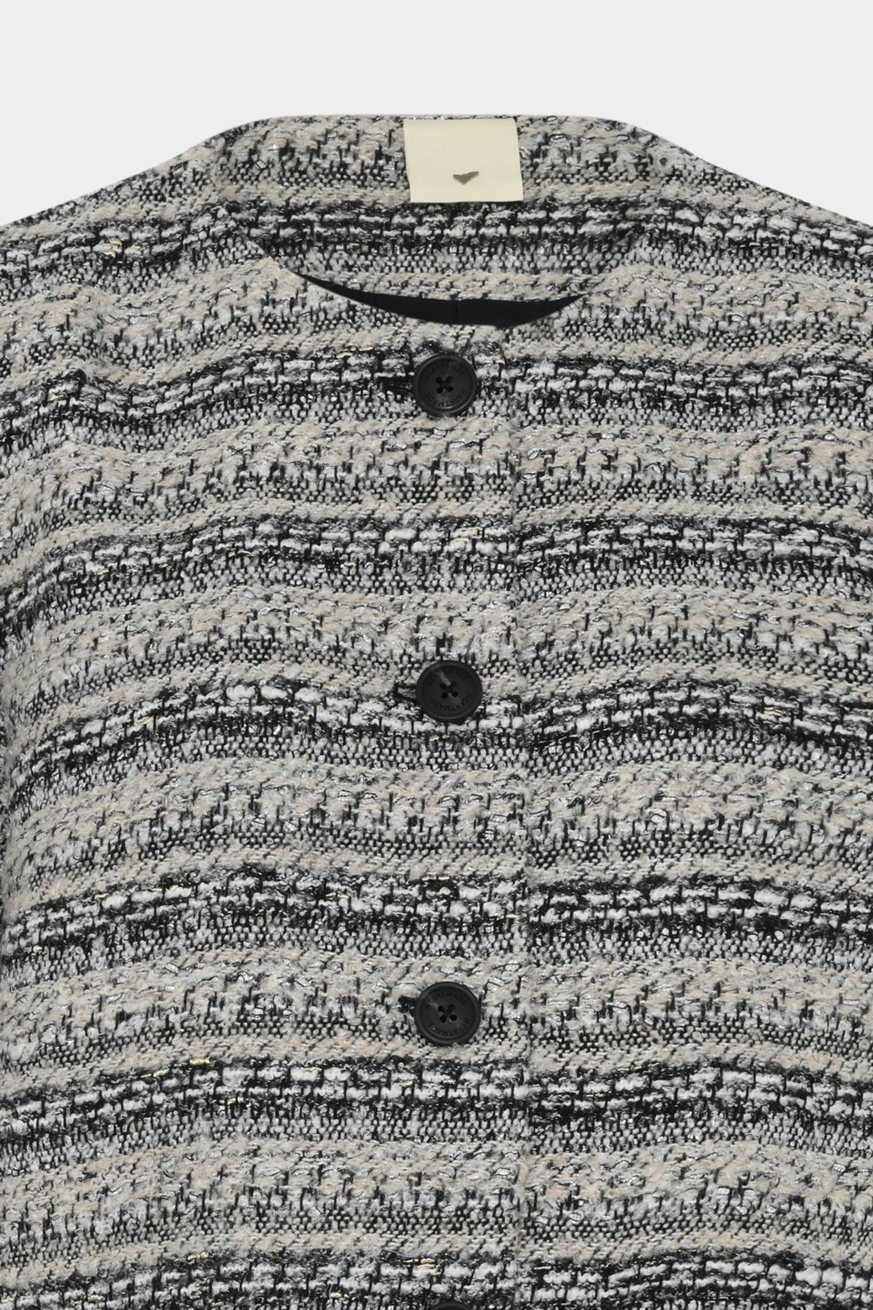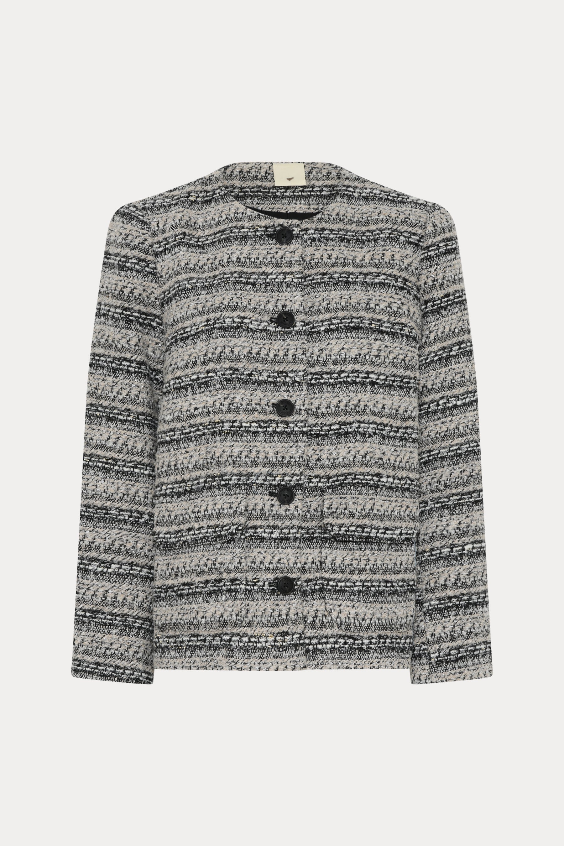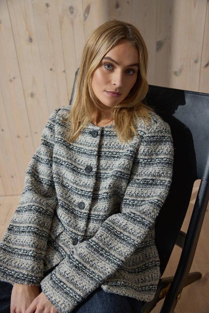 HMJaper jakke er en kort, struktureret jakke med rund halsudskæring, frontlommer og markerede skuldre. En moderne fortolkning af det klassiske bouclé-udtryk.