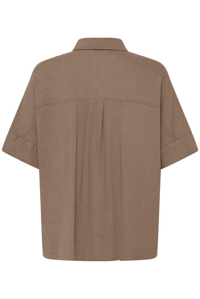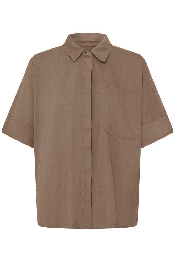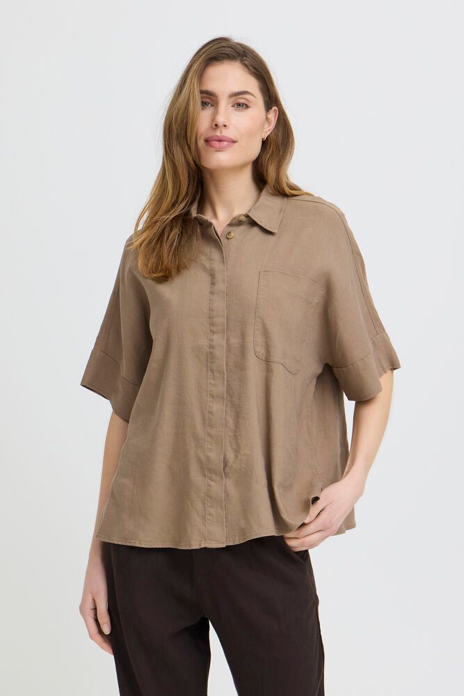 Let hør/viskose-skjorte med skjulte knapper, korte ærmer, krave, lille slids i siden og påsyet brystlomme. Falder let og løst.