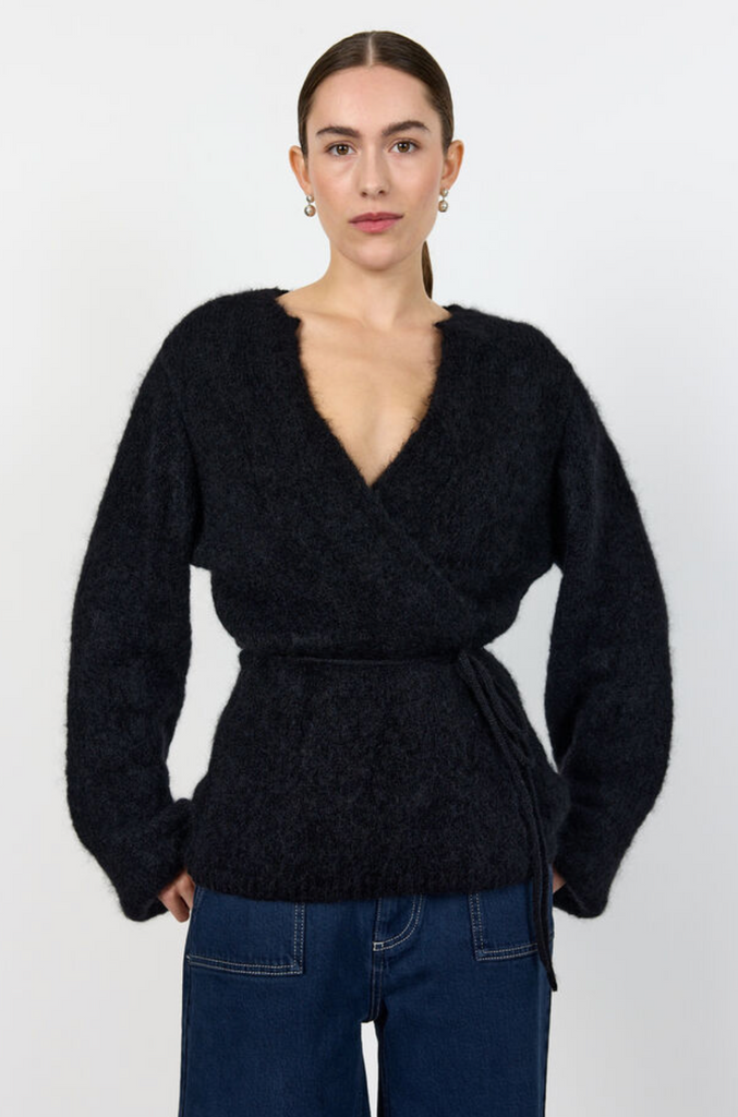 NOREEN 7 er en cardigan, der består af 53 % mohair, 45 % polyamid og 2 % elastan. Denne elegante cardigan har en klassisk V-hals, et bindebånd i taljen og lange ærmer med en blød tekstur. Sæt den sammen med skræddersyede bukser for et cool, sofistikeret look.