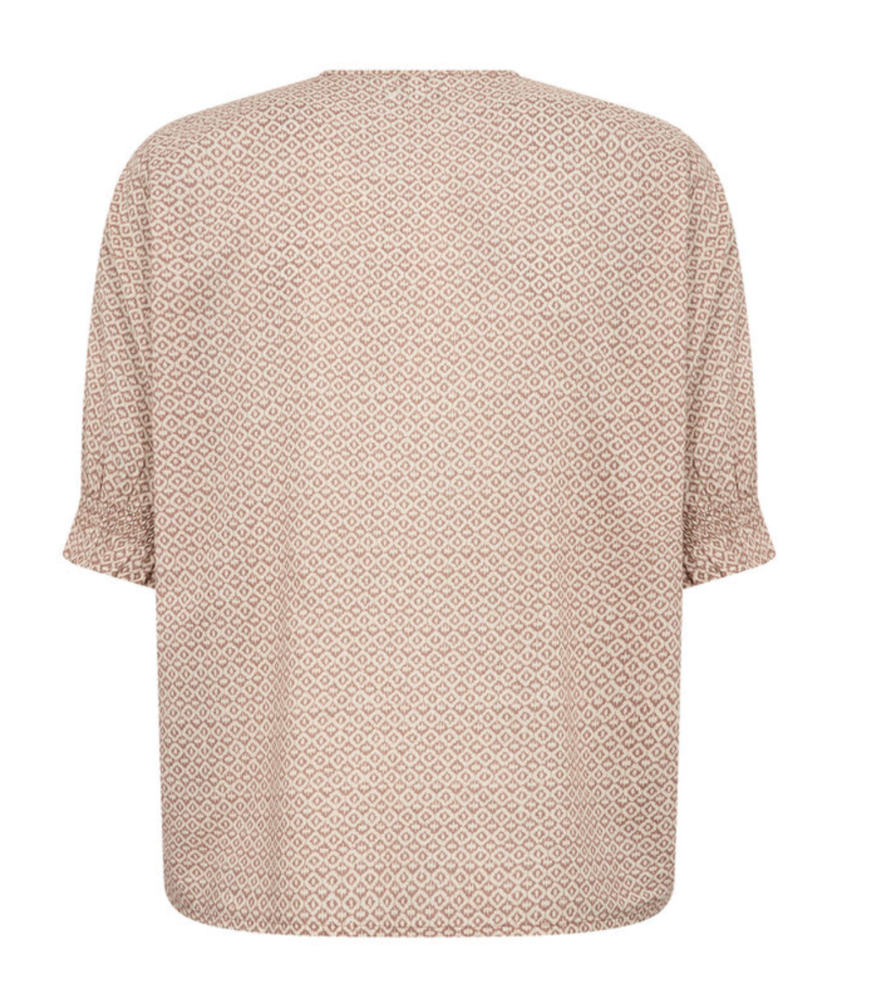 PALMA 2 er en feminin bluse fremstillet af 100 % økologisk bomuld. Den har en elegant V-udskæring, korte ærmer, knaplukning foran og et all-over geometrisk print. Sæt den sammen med skræddersyede bukser eller denim for et chikt look.