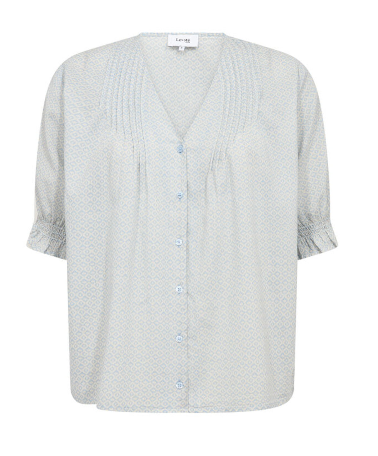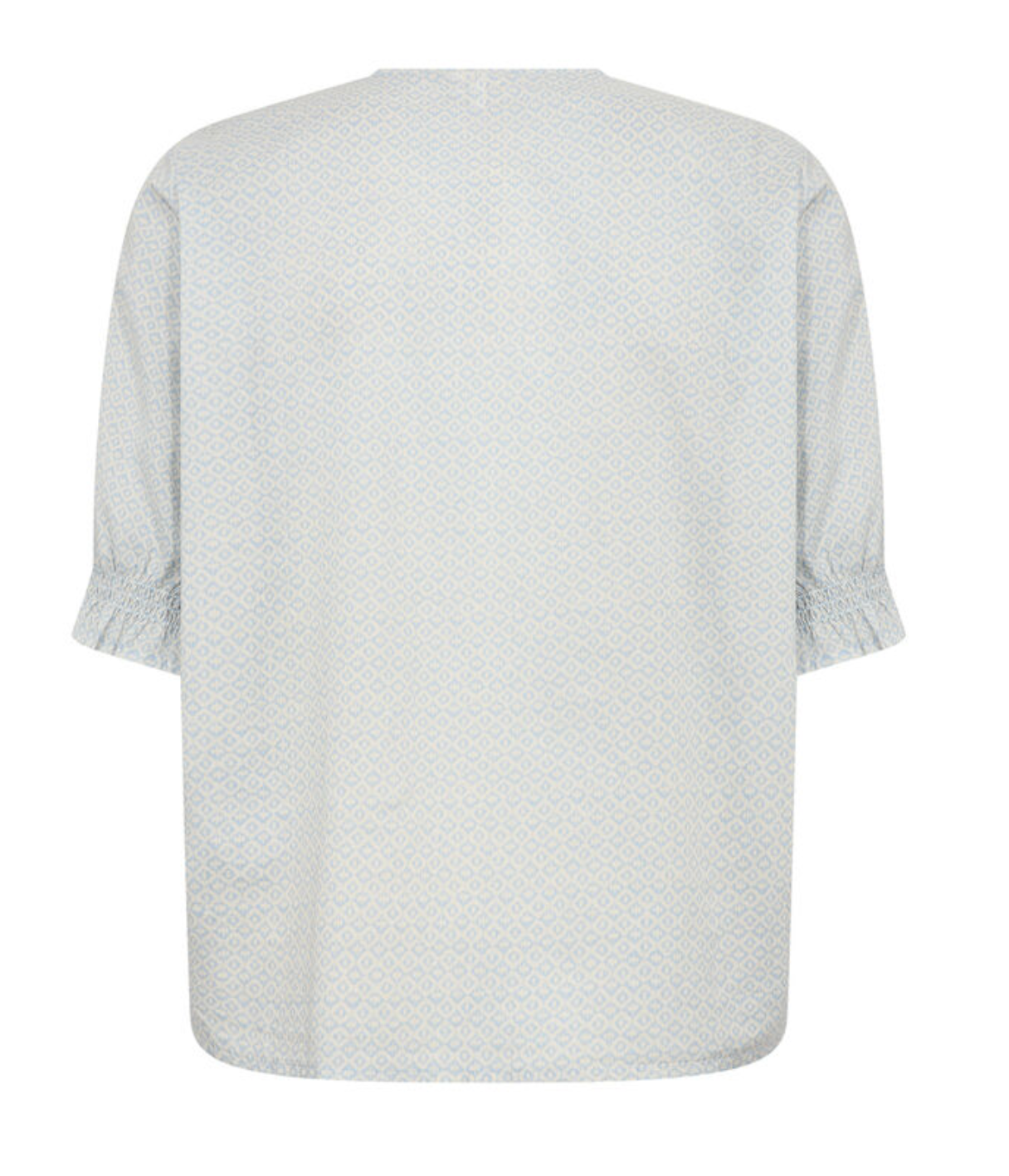 PALMA 2 er en feminin bluse fremstillet af 100 % økologisk bomuld. Den har en elegant V-udskæring, korte ærmer, knaplukning foran og et all-over geometrisk print. Sæt den sammen med skræddersyede bukser eller denim for et chikt look.