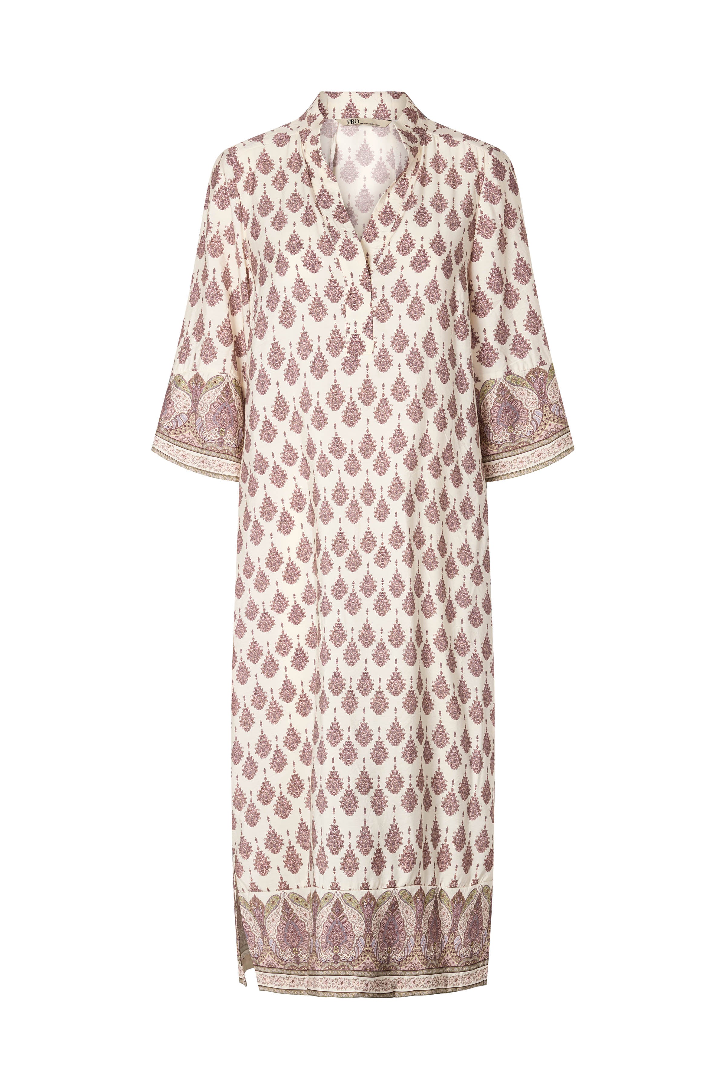 Simbia er en lang kjole med V-udskæring, stand-up krave og 3/4 ærmer. Det smukke paisley print og den løse pasform giver et moderne og elegant udtryk.