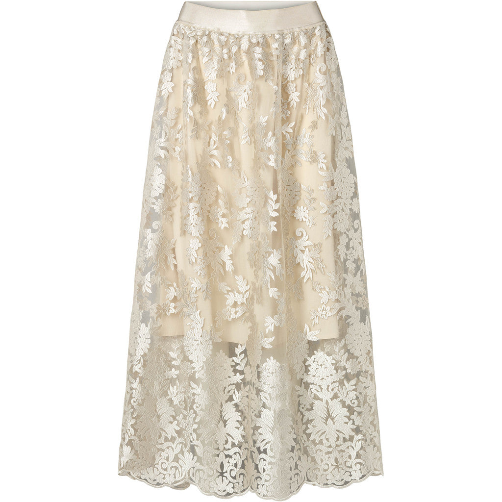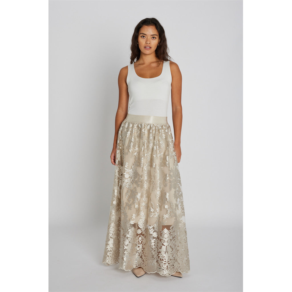 Venus skirt is a long, lightly A-shaped style in embroidered lace with an elasticated waist, creating an elegant and airy look.