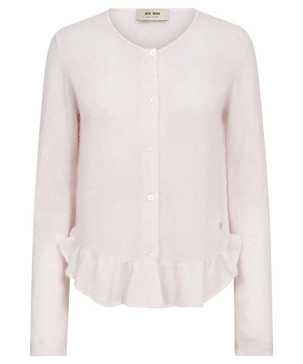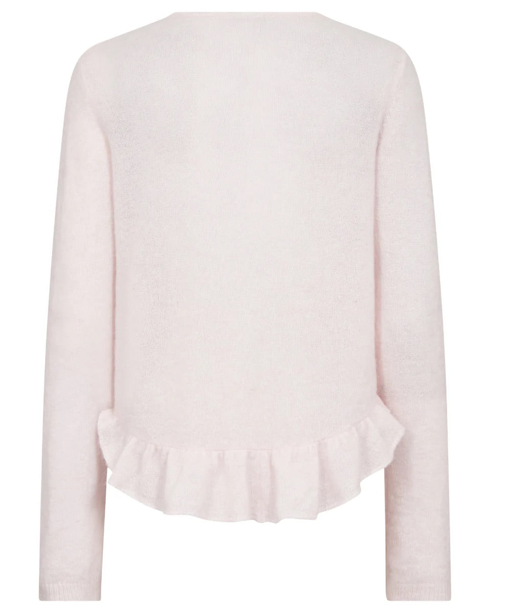 En blød cardigan i en uldblanding med lange ærmer, knaplukning og fine flæsedetaljer ved kanten. Den flatterende pasform og feminine udformning gør den perfekt til at tilføje struktur og et elegant touch til hverdagslooket.
