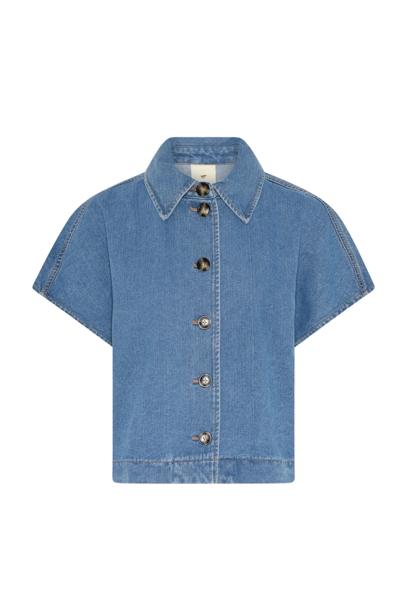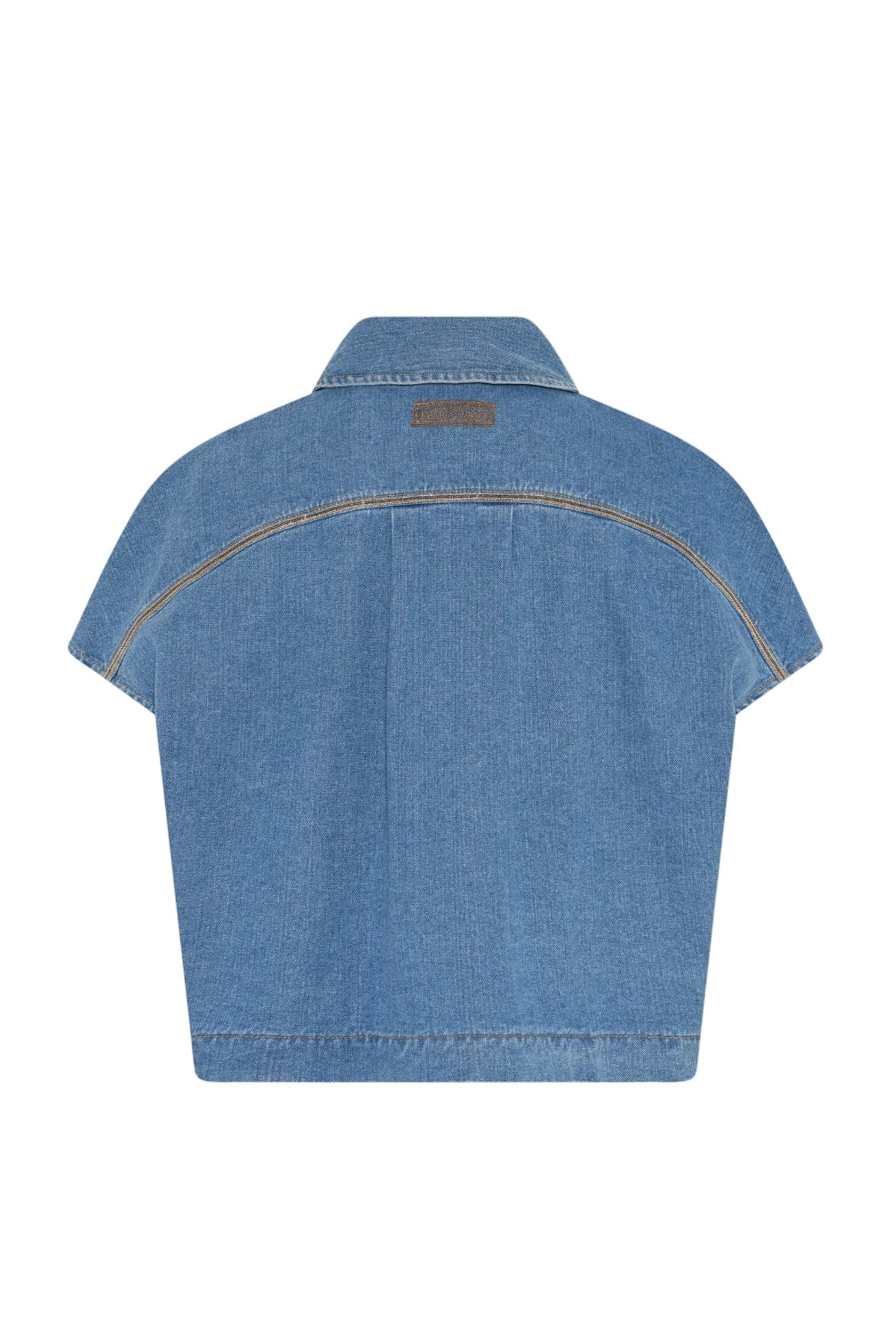 Binca denim cape is a short, straight denim cape with a sharp collar, defined stitching, and a structured, boxy silhouette.