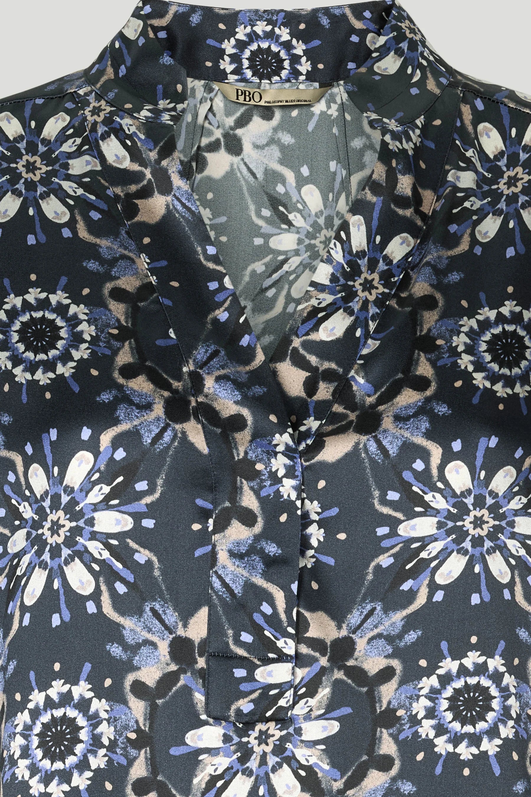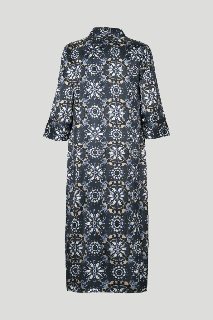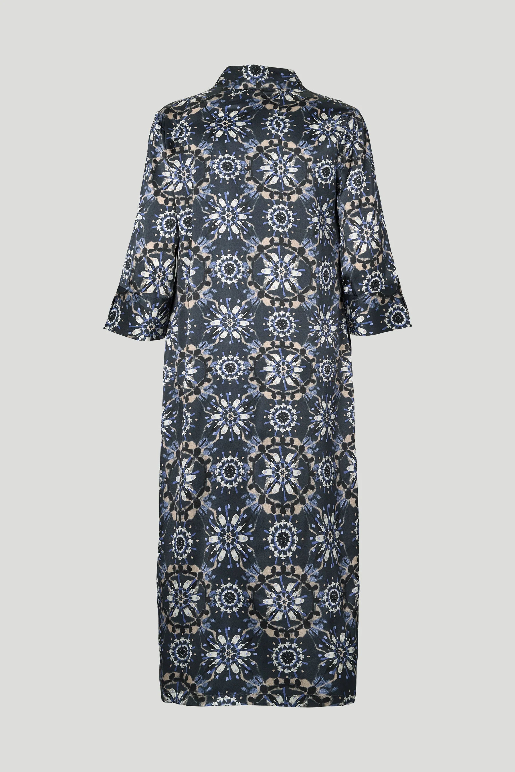 imbia er en lang kjole med V-udskæring, stand-up krave og 3/4 ærmer. Det grafiske print og den løse pasform giver et moderne og elegant udtryk.