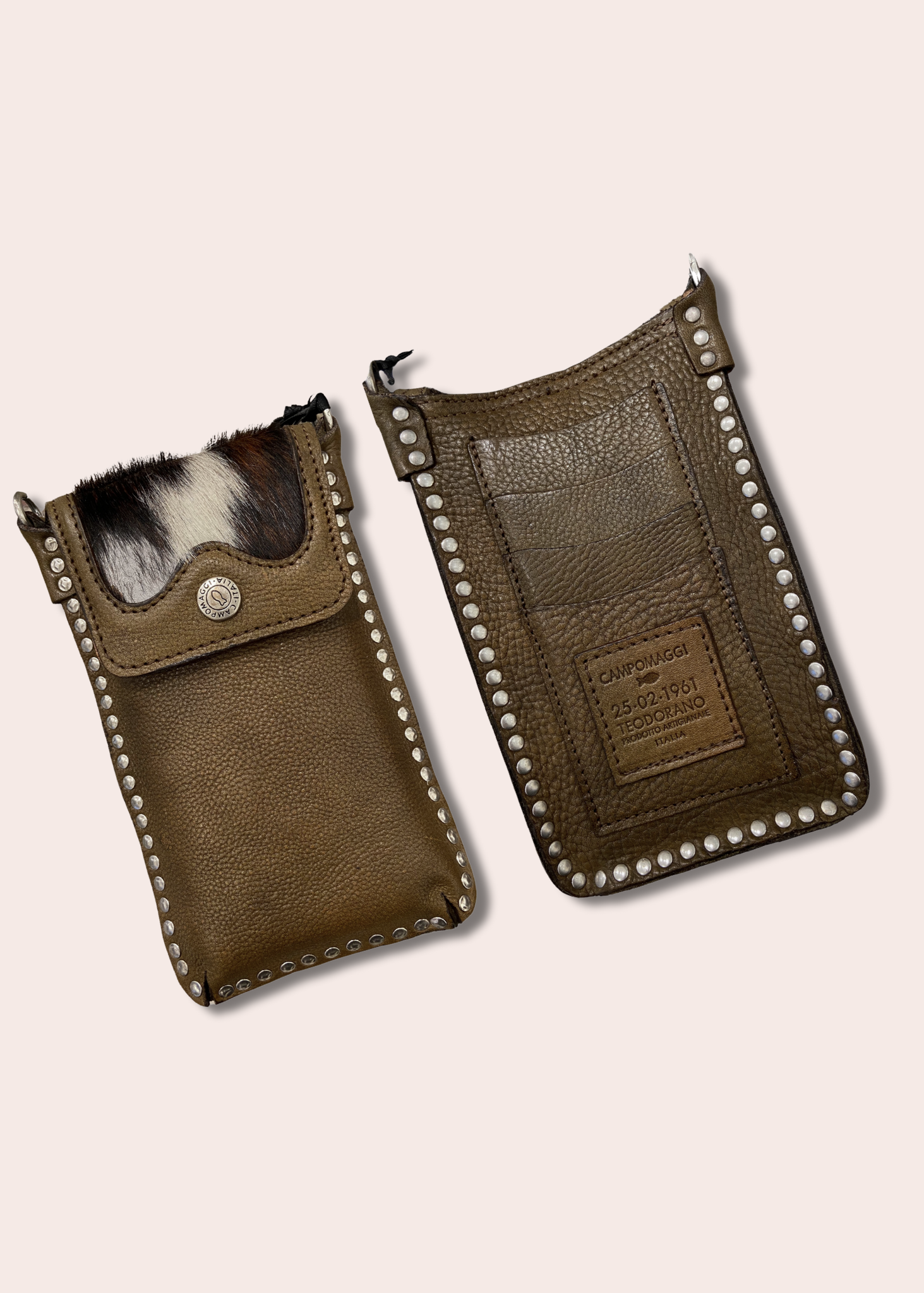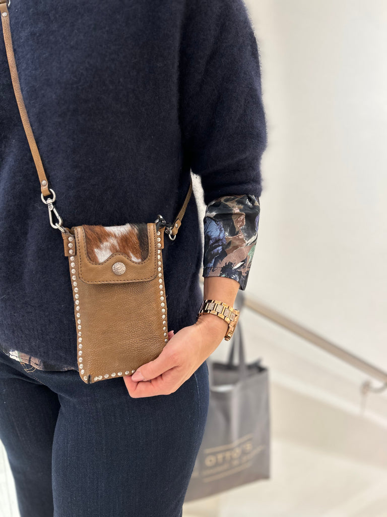 Taske til telefon med plads til diverse kort. Lang rem medfølger. Hardware i antik sølv. Lukkes med knap.