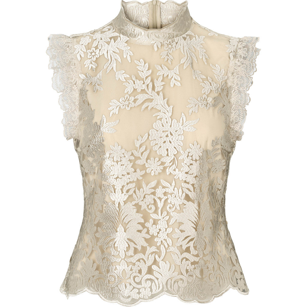 Odino top is a fitted, sleeveless style in embroidered lace with a high neckline and decorative edges, creating a refined and feminine look.