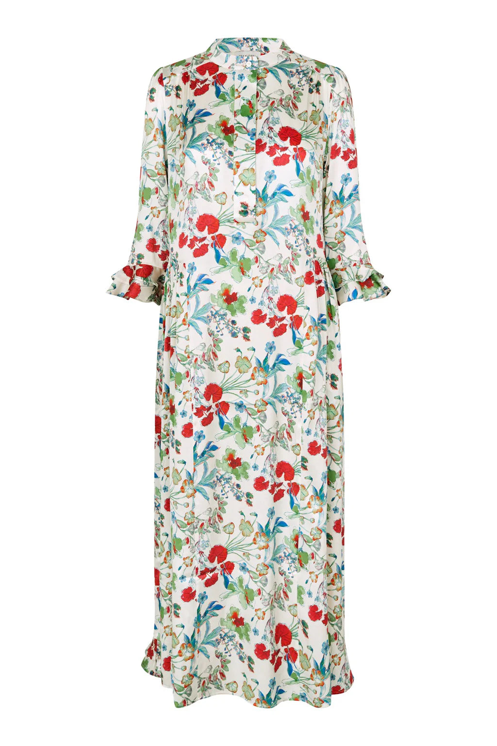Smuk lang silkekjole med flæser på ærmerne. Stolpelukning med knapper samt flæser bagpå forneden.